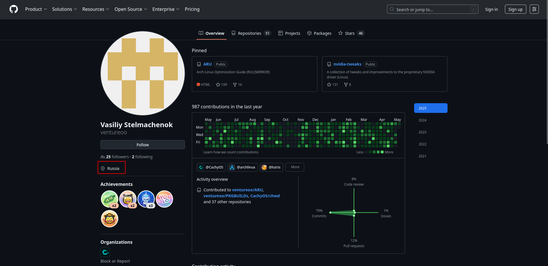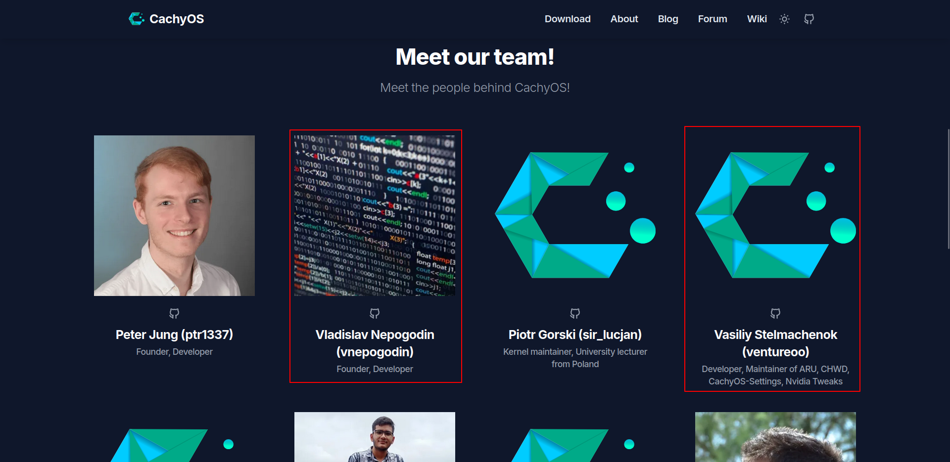 CachyOS — геймінг дистрибутив, заснований німцем та московитом. Хоча і не підтверджено якої саме позиції притримуються вони відносно Московитсько-Української війни, наявність серед засновників, а також розробників, московитів, доволі напрягає, оскільки це явно не рядові люди, а "командири", котрі можуть напряму впливати на проєкт, особливо його безпеку. До того ж такого московита, що, за власними заявами, не планує нікуди звідти переїжджати.